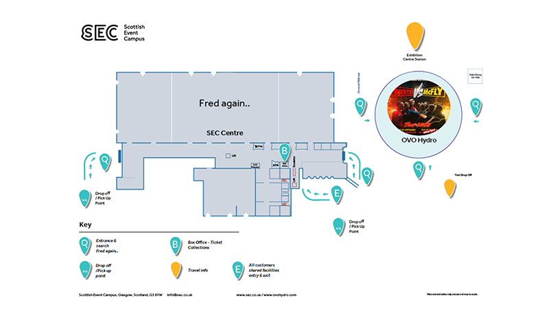 - If you’re walking or coming from the train station, you might want to avoid congestion in the Covered Walkway and come via Finnieston Street or from Partick. Click here for a site map.